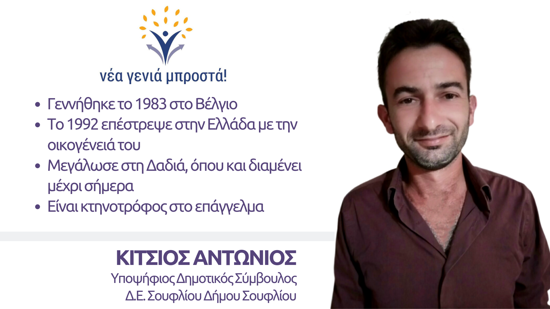 Ο συνδυασμός μας αποτελεί μια ελπιδοφόρα σύνθεση απόψεων και ανθρώπων που μας ενώνει η διάθεση να βελτιώσουμε την ποιότητα ζωής των συνδημοτών μας και να αναδυθεί ο Δήμος μας από την αφάνεια. Στηρίζεται σε "νέους" στη νοοτροπία ανθρώπους, με πάθος, όρεξη και καθαρούς σκοπούς για την εξέλιξη του Δήμου, που θα έχει ως επίκεντρο όλους τους δημότες, ανεξαρτήτως ηλικίας, θέσης, θρησκείας, φύλου, καταγωγής ή πεποιθήσεων.